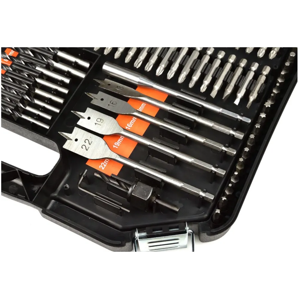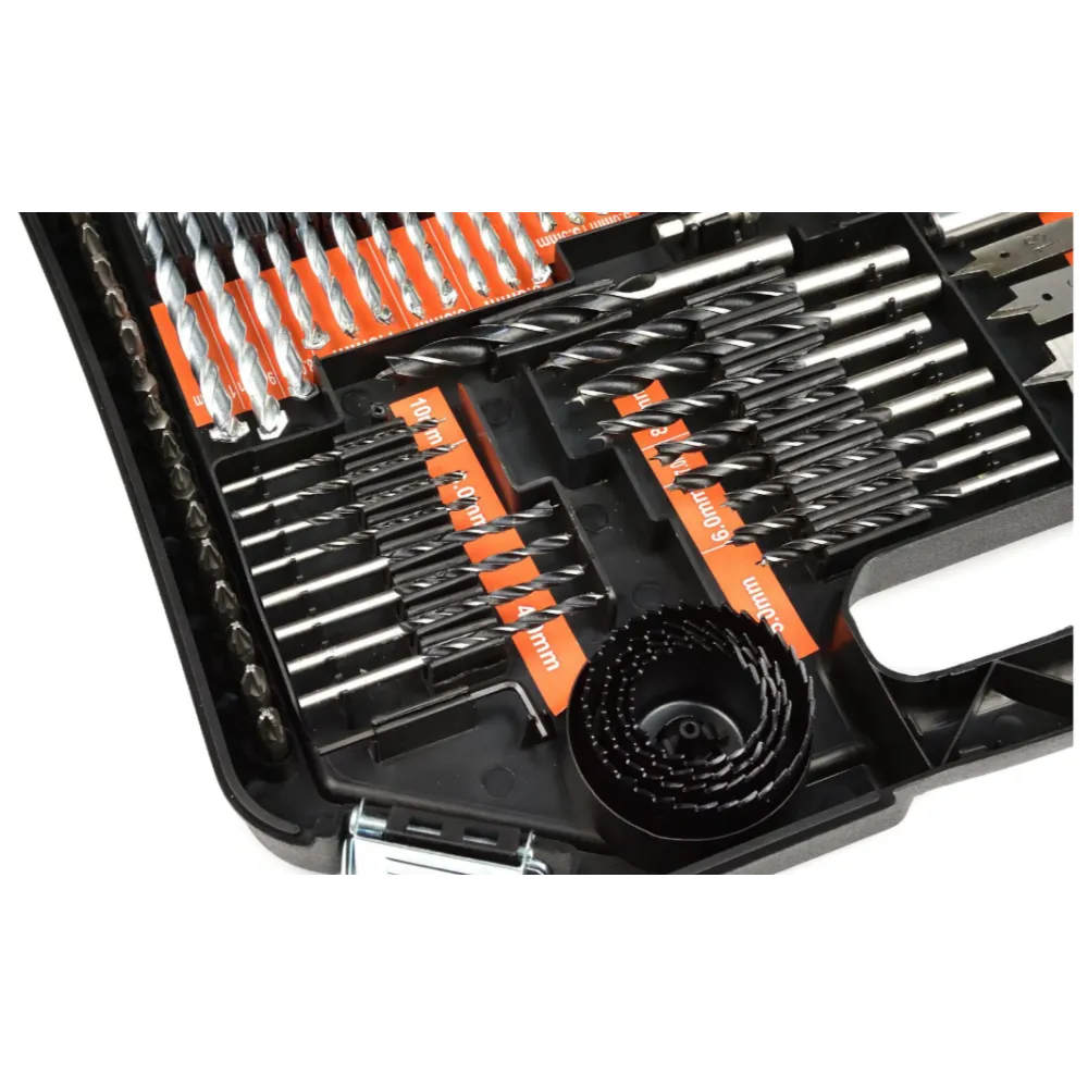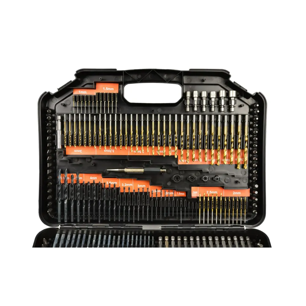 Un set extins de burghie, burghie, ferastrau cu gaura si prize pentru surubelnita. Setul va fi folosit in fiecare atelier de bricolaj. Intregul set este ambalat intr-o cutie de plastic la indemana.