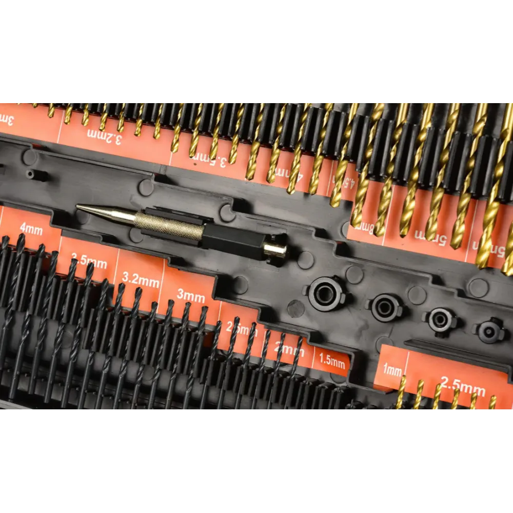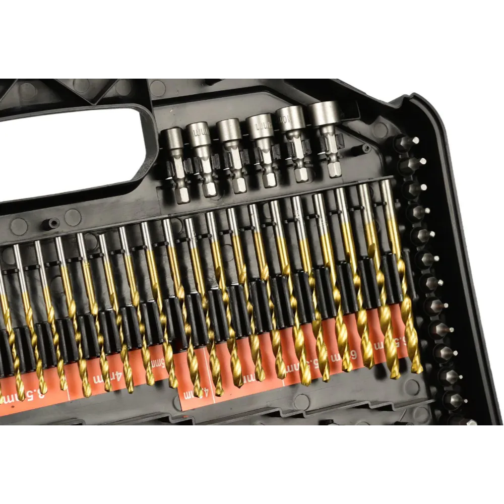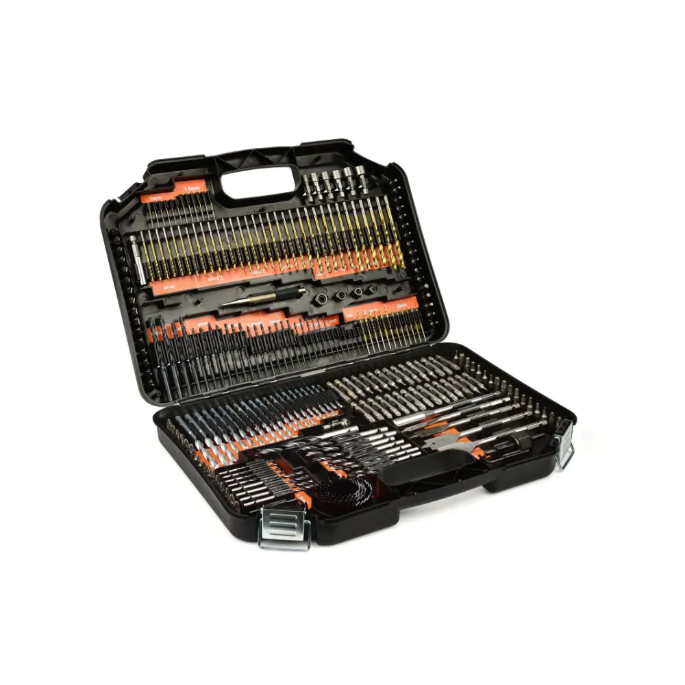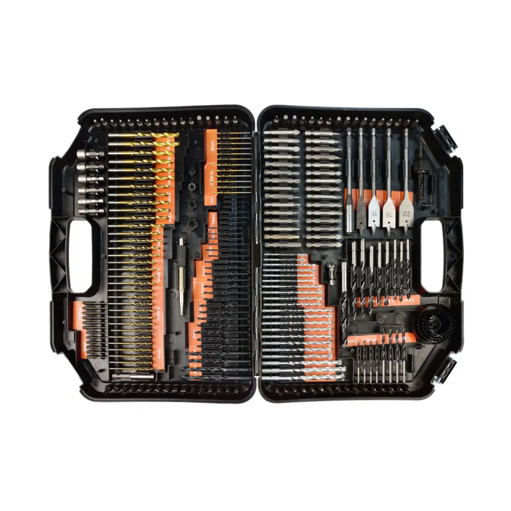 Un set extins de burghie, burghie, ferastrau cu gaura si prize pentru surubelnita. Setul va fi folosit in fiecare atelier de bricolaj. Intregul set este ambalat intr-o cutie de plastic la indemana.