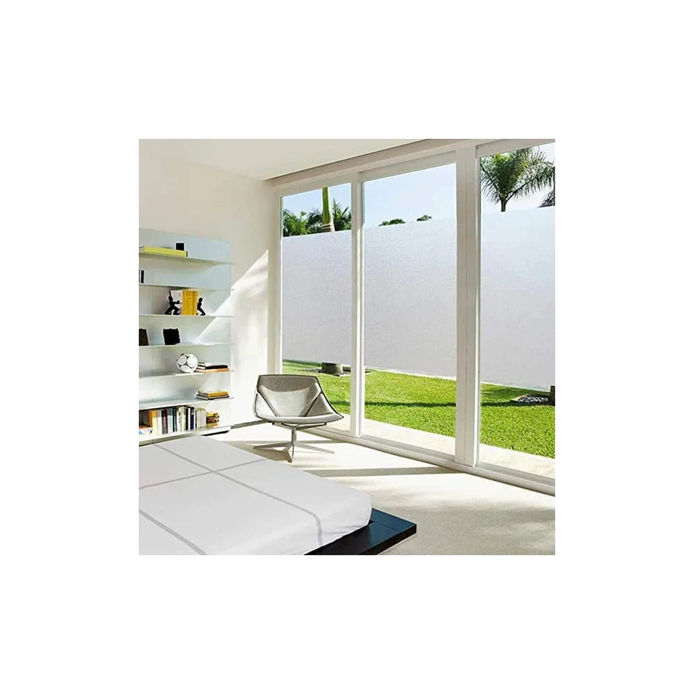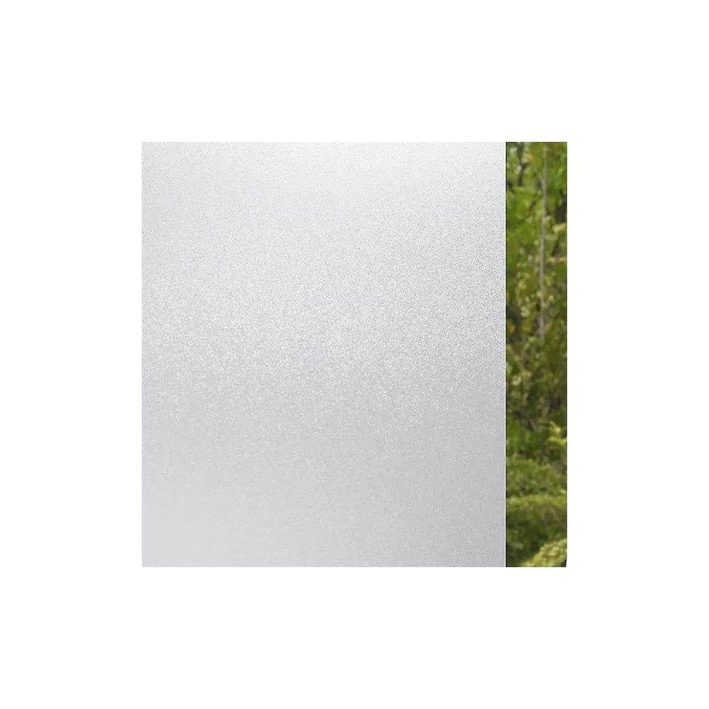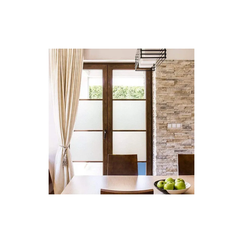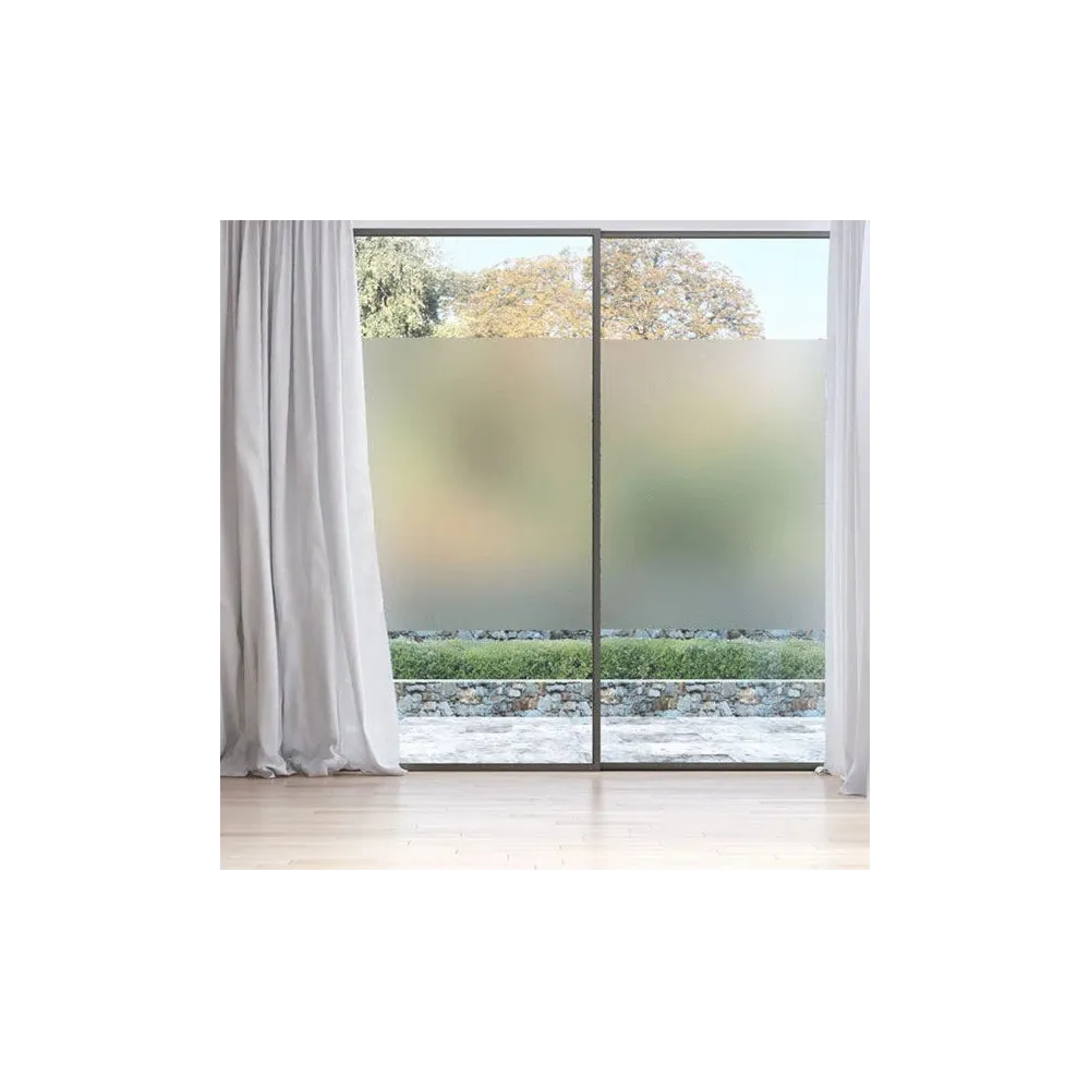 „Folie decorativă mată tip sablare pentru geam. Reduce vizibilitatea directă, dar nu este 100% opacă – lasă lumina să treacă și se pot distinge ușor siluete/umbre.”