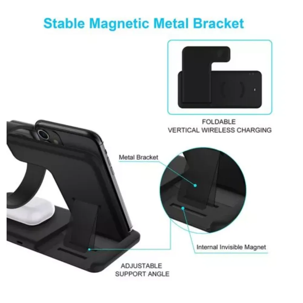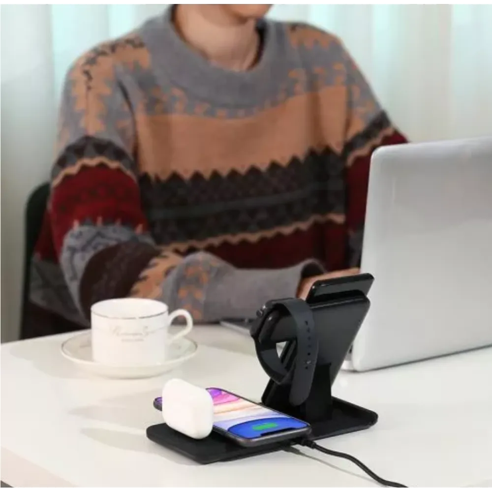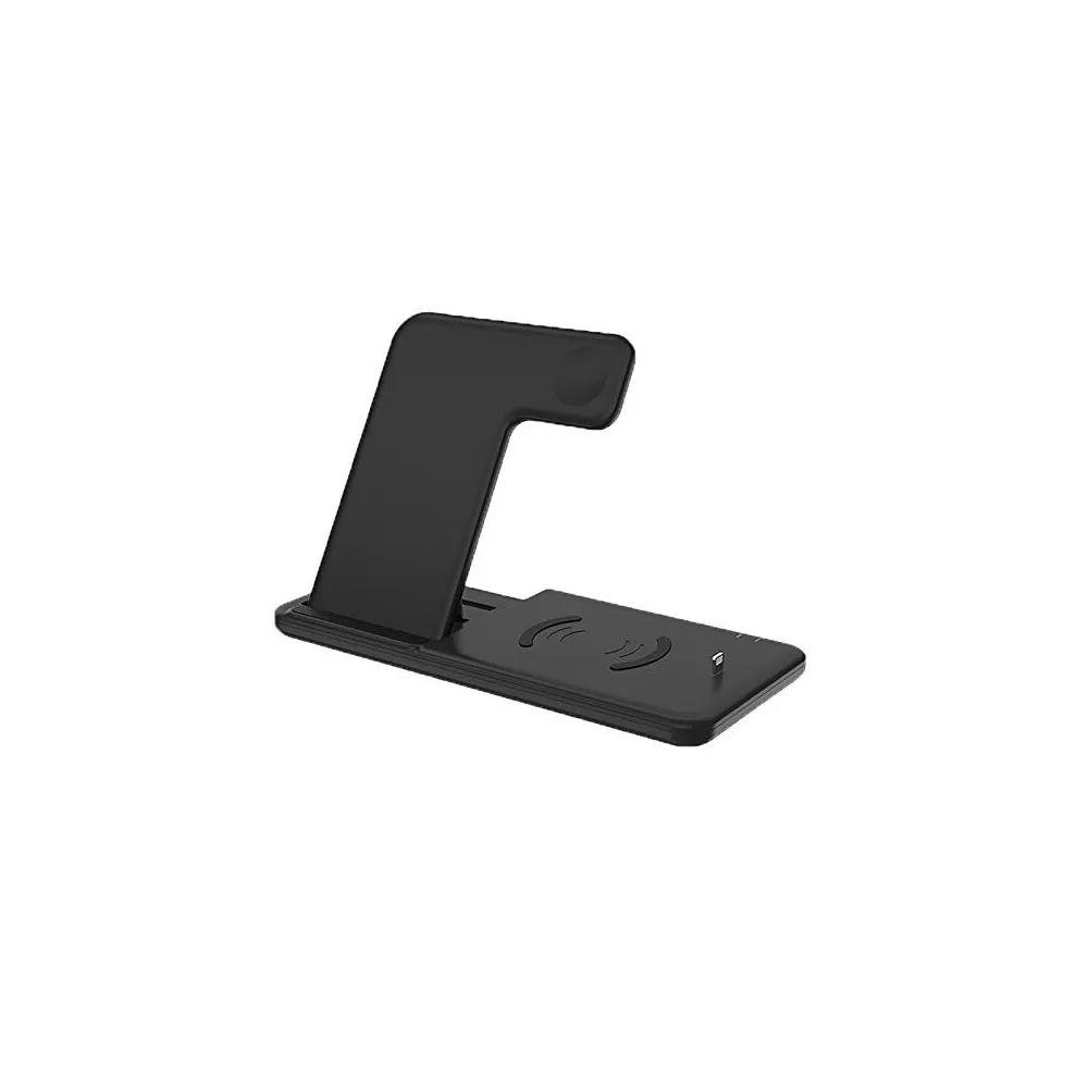 Platforma principala de incarcare detine si suport pentru pozitionarea verticala in functie de nevoie, si acomodeaza un telefon cu incarcare fast charging(15W/10W/7.5W sau 5W in functie de solicitarea telefonului) precum si o platforma de 2W pentru iWatch seriile 1/2/3/4/5.