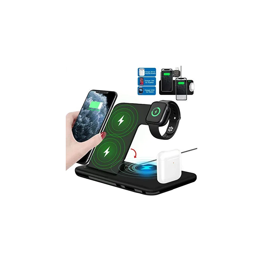 Statie de incarcare QI Wireless 4 in 1 15W pentru 2 telefoane, iWatch si AirPods, negru. Statia de incarcare Wireless 15W suporta incarcare a maxim 4 dispozitive , cu 3 platforme wireless si un dock lightning.