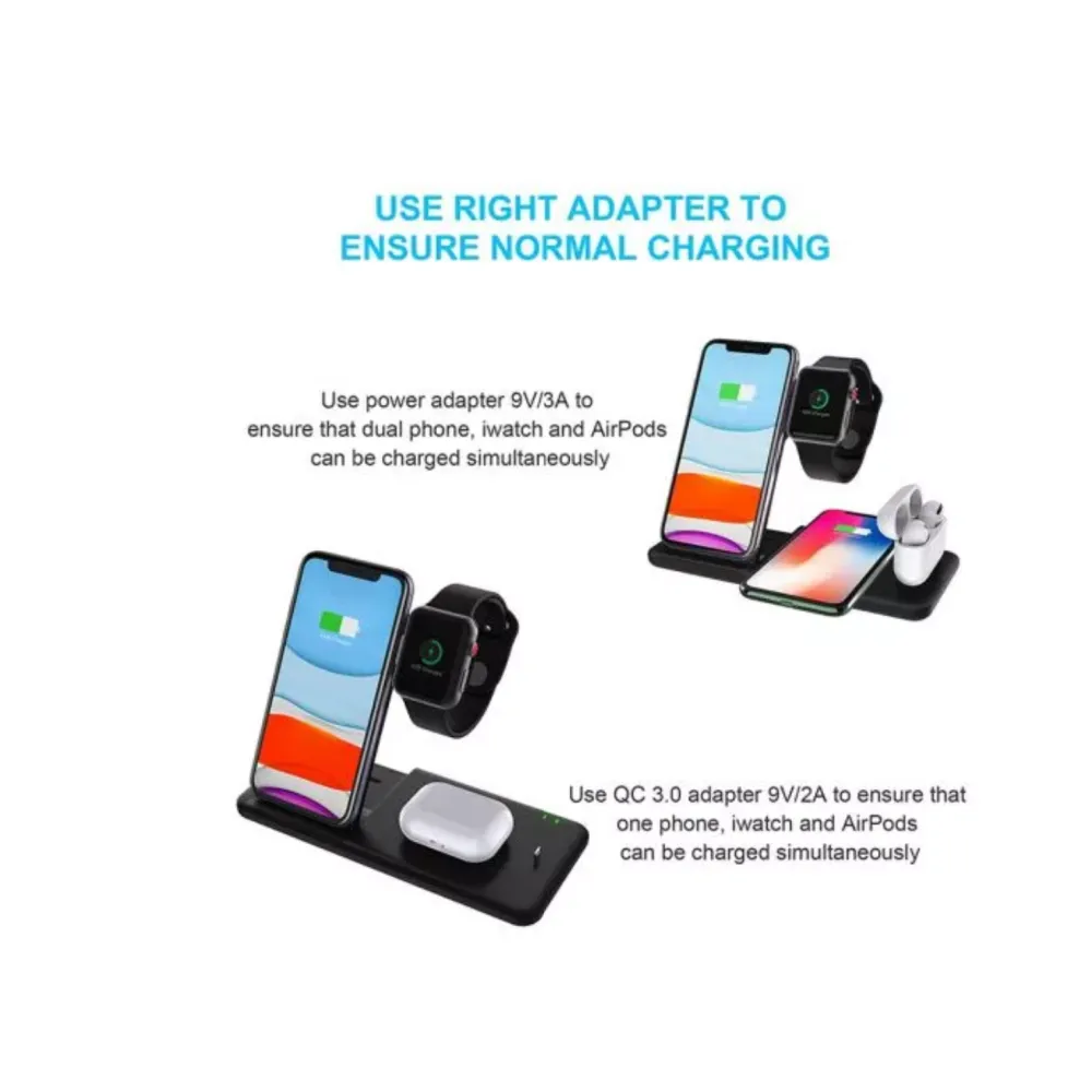 Folositi un incarcator de priza USB de 9V/3A pentru a putea alimenta wireless 2 telefoane, iWatch si AirPods simultan. Utilizati un incarcator Quick Charge2.0/3.0 9V/2A pentru a incarca wireless un telefon, iWatch precum si AirPods.