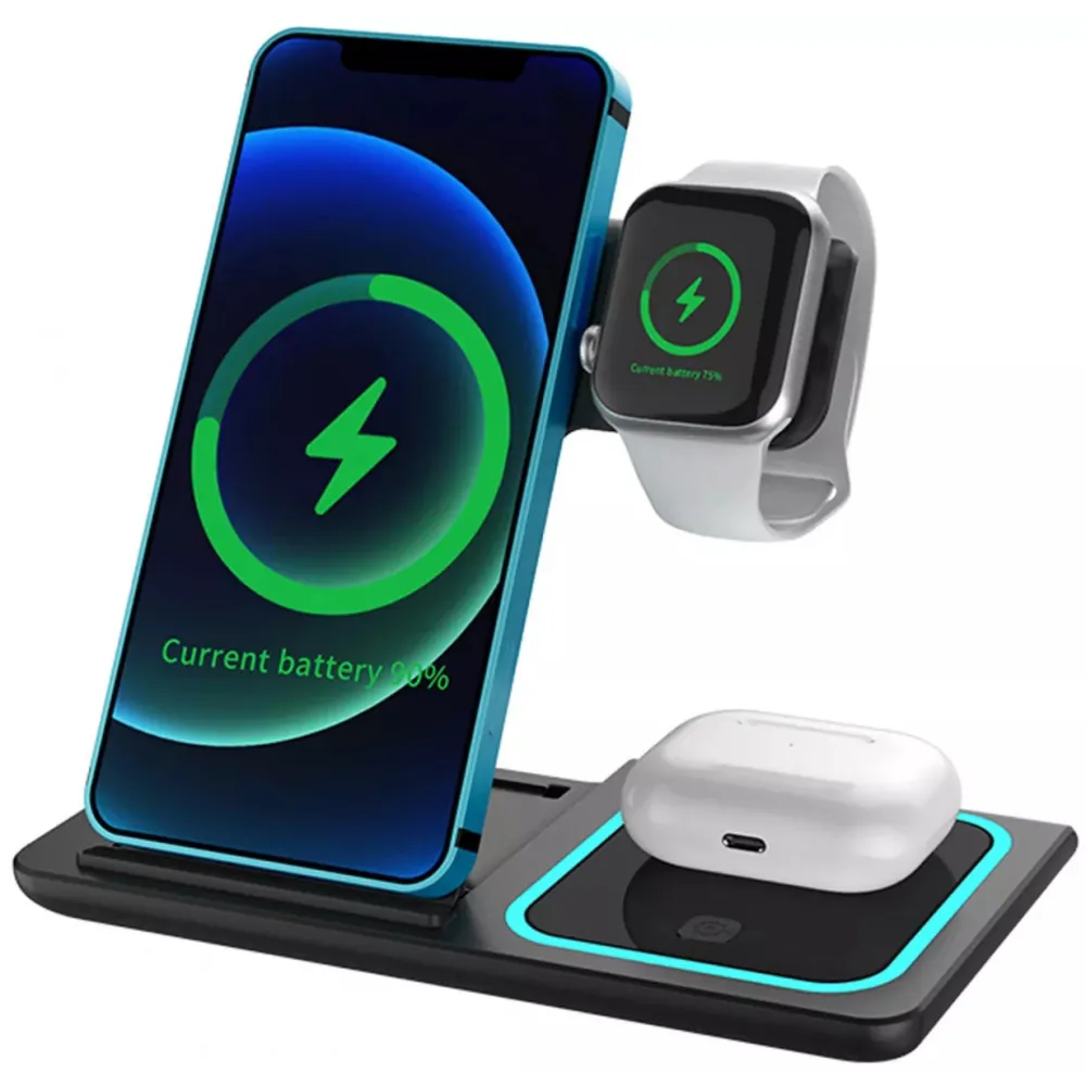 Statia de incarcare wireless 3 in 1 suporta telefoane Apple/Android cu functie de incarcare wireless, toate modelele de ceasuri smart Apple si Airpods cu incarcare wireless/Airpods PRO.