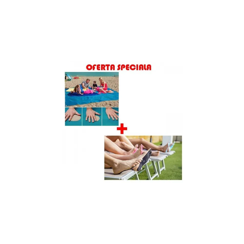 Aceast? p?tur? Sand Free este potrivit? pentru plaj?, picnic, parc sau excursii, Nisipul pur ?i simplu dispare! Este compus? din dou? straturi inteligente, astfel încât nisipul s? nu stea pe ea, dar în acela?i timp face ca nisipul s? cad? ?i s? nu v? deranjeze, Acest lucru ajut? ca pe p?tur? s? nu existe nici un gr?unte de nisip,Descriere detaliat?: Material: PVC Material impermeabil Dimensiuni: 200cm x 200cm Culoare: albastr?Con?inut ambalaj: 1x P?tur? de plaj? Sand free+Talpici antiderapante Va prezentam talpicile adezive antiderapante,Acest produs este bun pentru a va proteja picioarele de nisipul fierbinte, Acum te poti distra pe plaja cu prietenii fara a fi deranjat de nisipul incins, scoici si pietricele,Acest produs este rezistent la apa,Daca va faceti griji ca puteti aluneca atunci cand iesiti din piscina va recomandam aceste talpici adezive care sunt antiderapante,Marimi disponibile:M 36-39L 40-43Culori disponibile :roznegru
