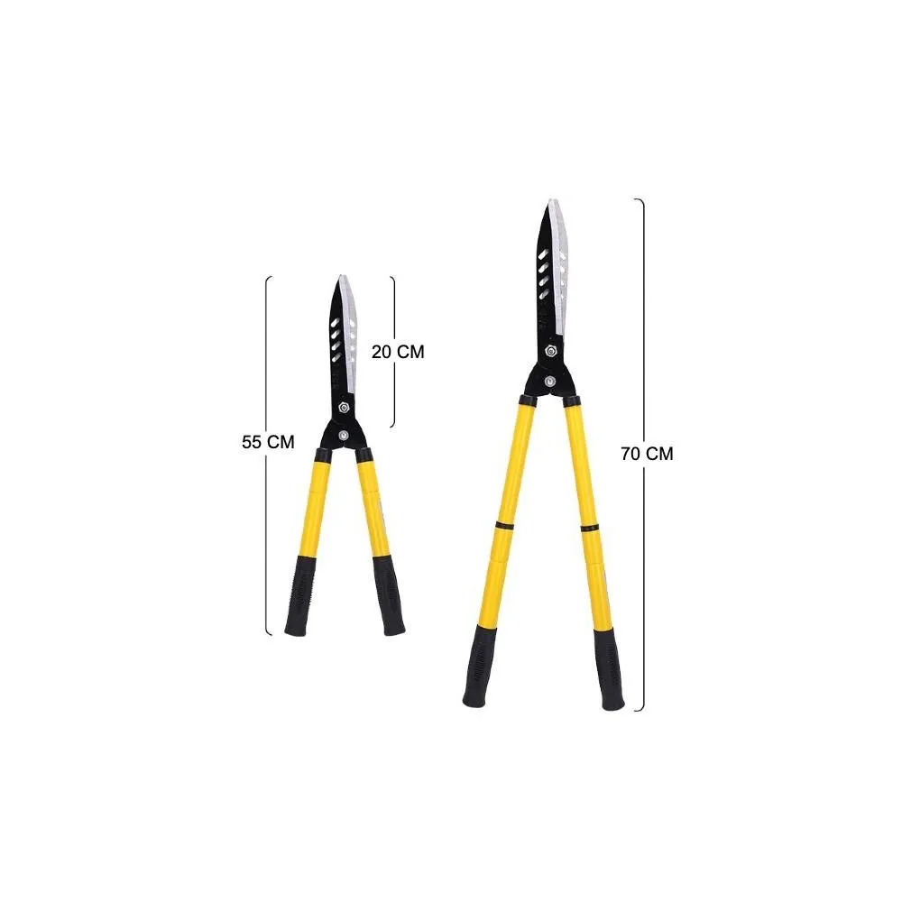 Foarfeca extensibila pentru gard viu, 70 cm, maner ergonomic. Unealta puternica si robusta de calitate superioara pentru tunderea profesionala a gardului viu. Lame late calite cu margini de taiere din metal slefuit. Manerele telescopice din otel cu dispozitivele de prindere din PVC asigura o prindere buna in timpul taierii. Recomandam lubrifierea foarfecii, atat in perioada de utilizare cat si pe durata depozitarii, astfel incat sa functioneze usor si sa prelungiti durata de utilizare.