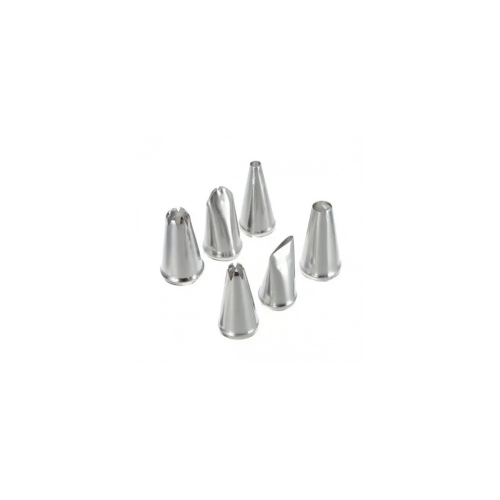 Set 6 duiuri profesionale din inox pentru ornat Punem la dispozitie un set de produse, excelent pentru orice tip de bucatarie, fie aceasta casnica sau din cadrul unui restaurant: Setul cu 6 duiuri profesionale din inox pentru ornat, Aceste 6 duiuri sunt realizate din otel inoxidabil si sunt ideale pentru a realiza torturi sau prajituri cat mai interesante din punct de vedere estetic, Setul prezentat este format din 6 duze cu diverse forme, atat pentru utilizare profesionala, dar si casnica, Dupa utilizarea acestora le puteti curata usor in apa calda,